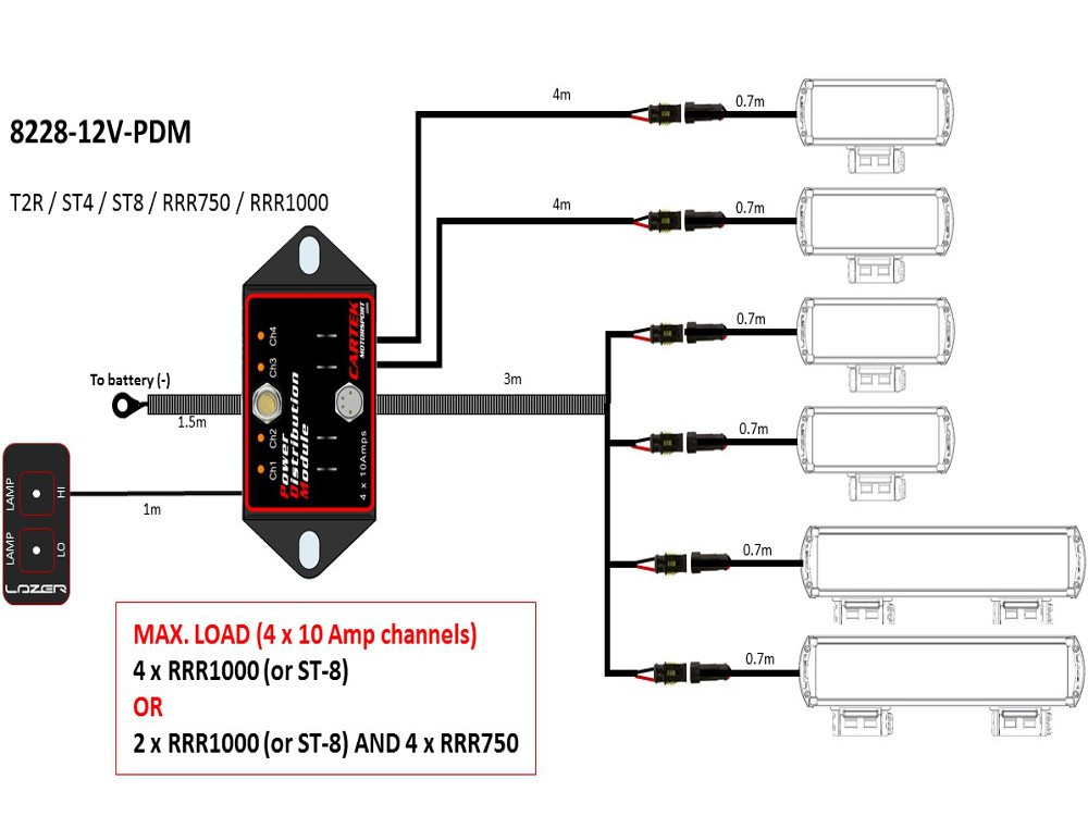 The professional solution for your rally setup encompassing four Lazer lamps, where power distribution is controlled by a Cartek 4-channel module which includes internal fuses, circuit breakers, and relays. Setup is quick, easy, and reliable with TE Superseal connections and no configuration procedures. Lights can be controlled using an LED dual pushbutton switch panel.