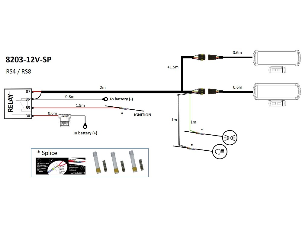 Lazer harness kits feature a 12V relay, 20A fuse, and battery terminal at one end. We use the best corrosion proof splice systems currently on the market, comprising copper crimp barrels and separate, heat-shrinkable transparent sealing sleeve, ensuring that the connections for: daytime running lights, position lights, and driving lights remain fully protected.
